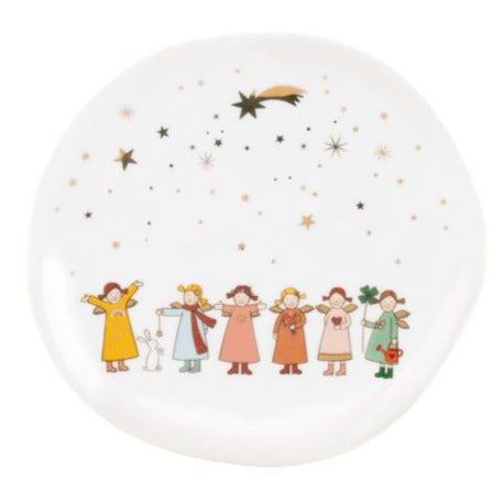 Dit bordje in wit geëmailleerd porselein met spelende kindjes onder de sterrenhemel brengt de vreugde onmiddellijk aan tafel.