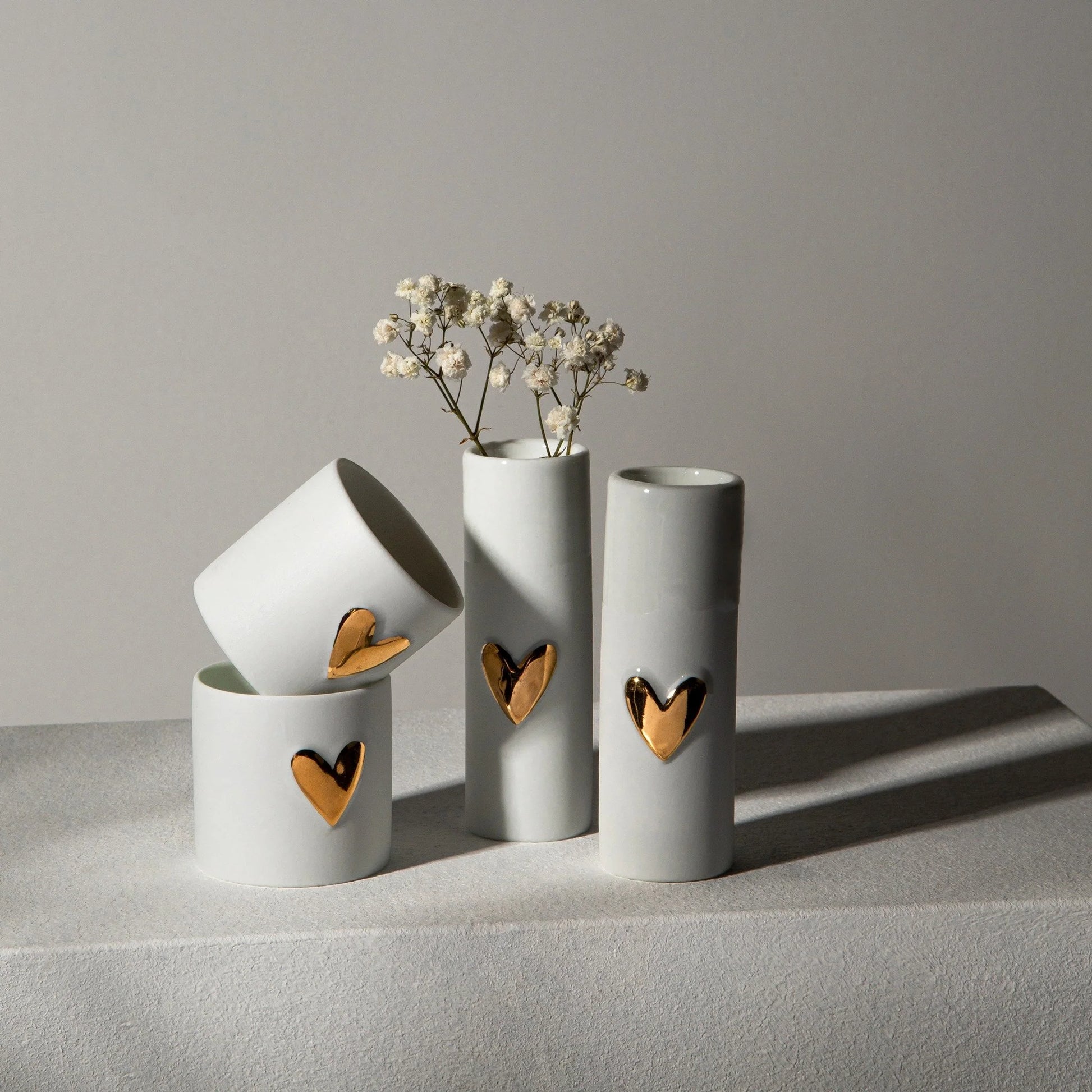 Handgemaakte vaasjes van het fijnste porselein. Een liefdevol setje met een sereen en tijdloos effect. Een cadeau voor de allerliefsten, of gewoon voor jezelf.