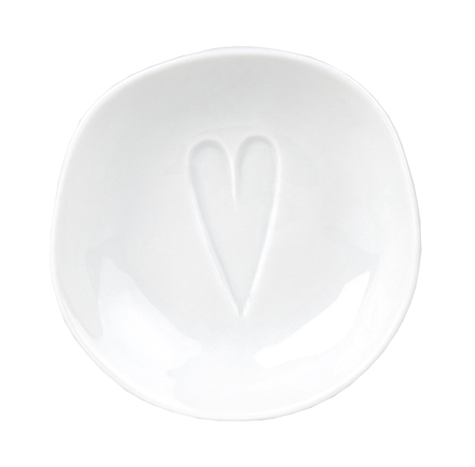 Dit schattige ieniemini kleine schaaltje is gemaakt van gedeeltelijk geglazuurd wit porselein en heeft in het midden een gestanst hartje. Het schaaltje is heel geschikt voor kleine lekkernijen of snuisterijen.