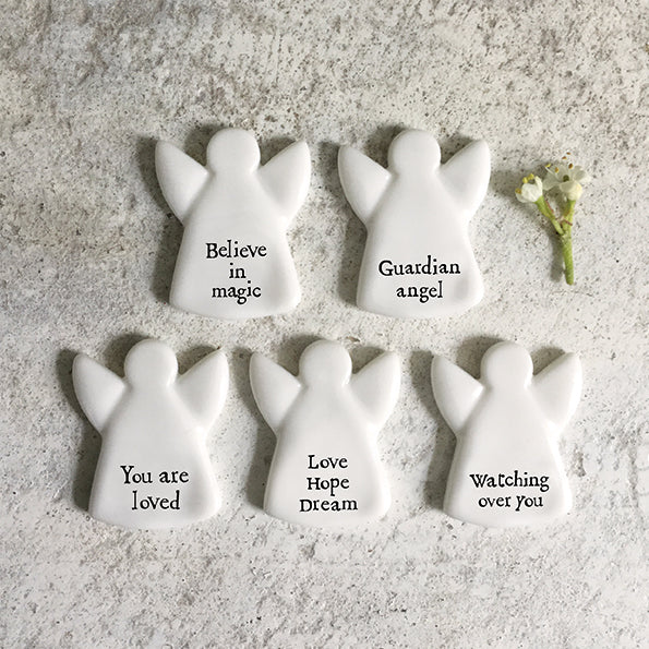 Een klein porseleinen engeltje met tekst 'Believe in magic'.