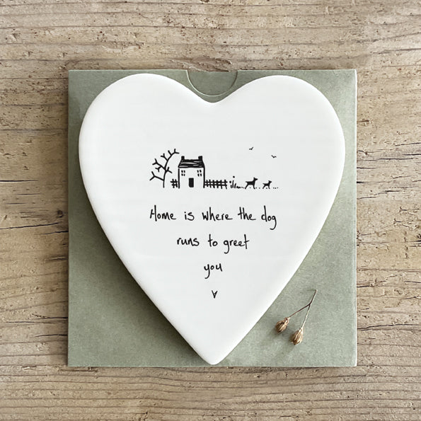 Het hart bevat de tekst: 'Home is where the dog runs to great you'. Het perfecte cadeau voor hondenliefhebbers.