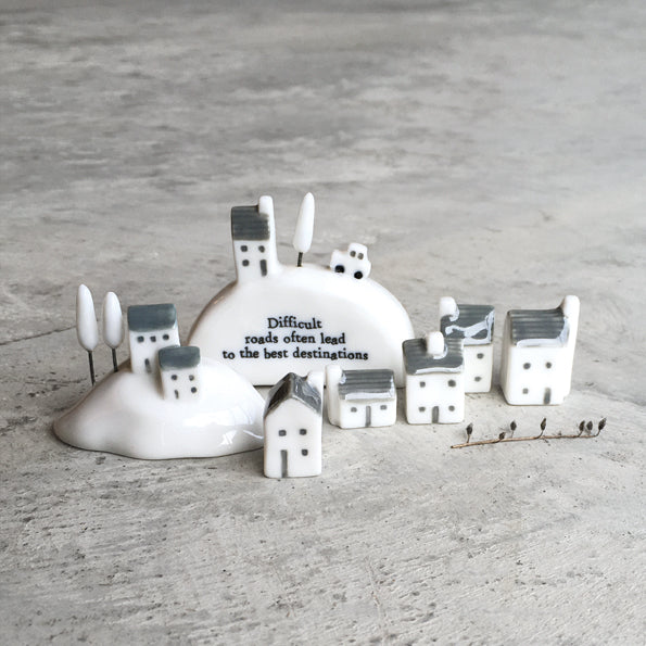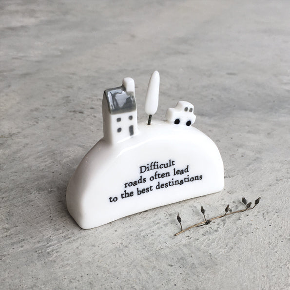 Een porsleinen beeldje met de tekst 'Difficult roads often lead to the best destinations'