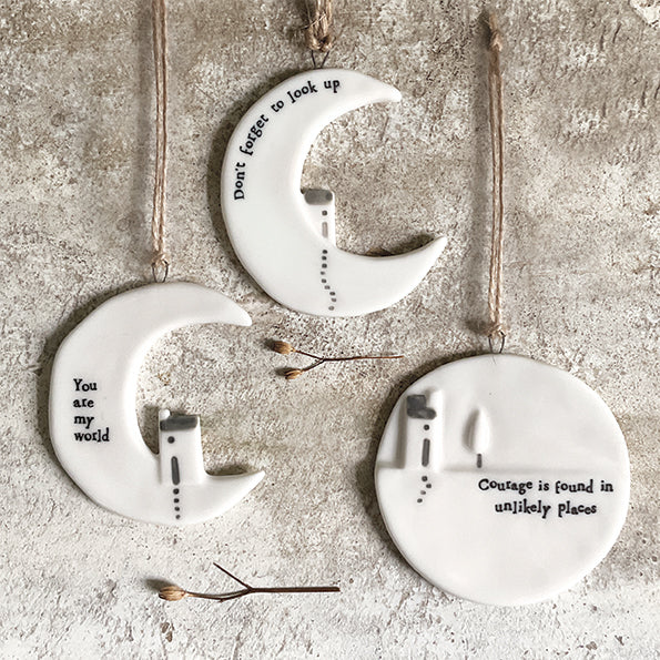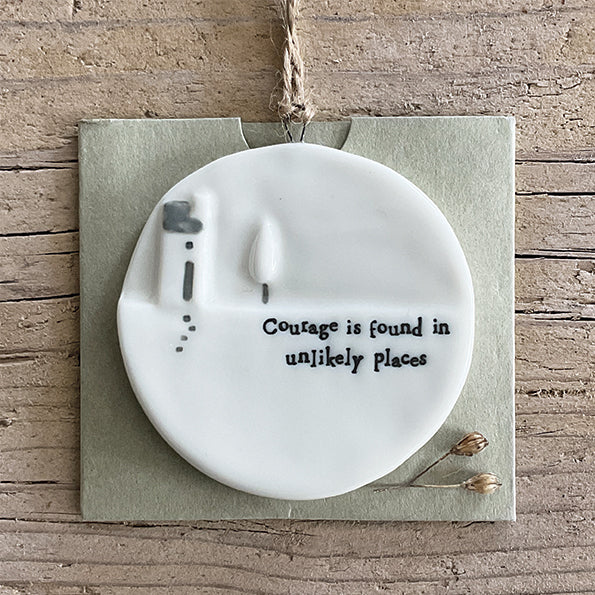 Een klein porseleinen hangertje in de vorm van een maan met de tekst 'Courage is found in unlikely places'.