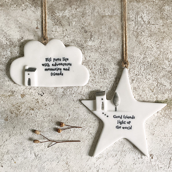 Een klein porseleinen hangertje in de vorm van een ster met de tekst 'Good friends light up the world'.