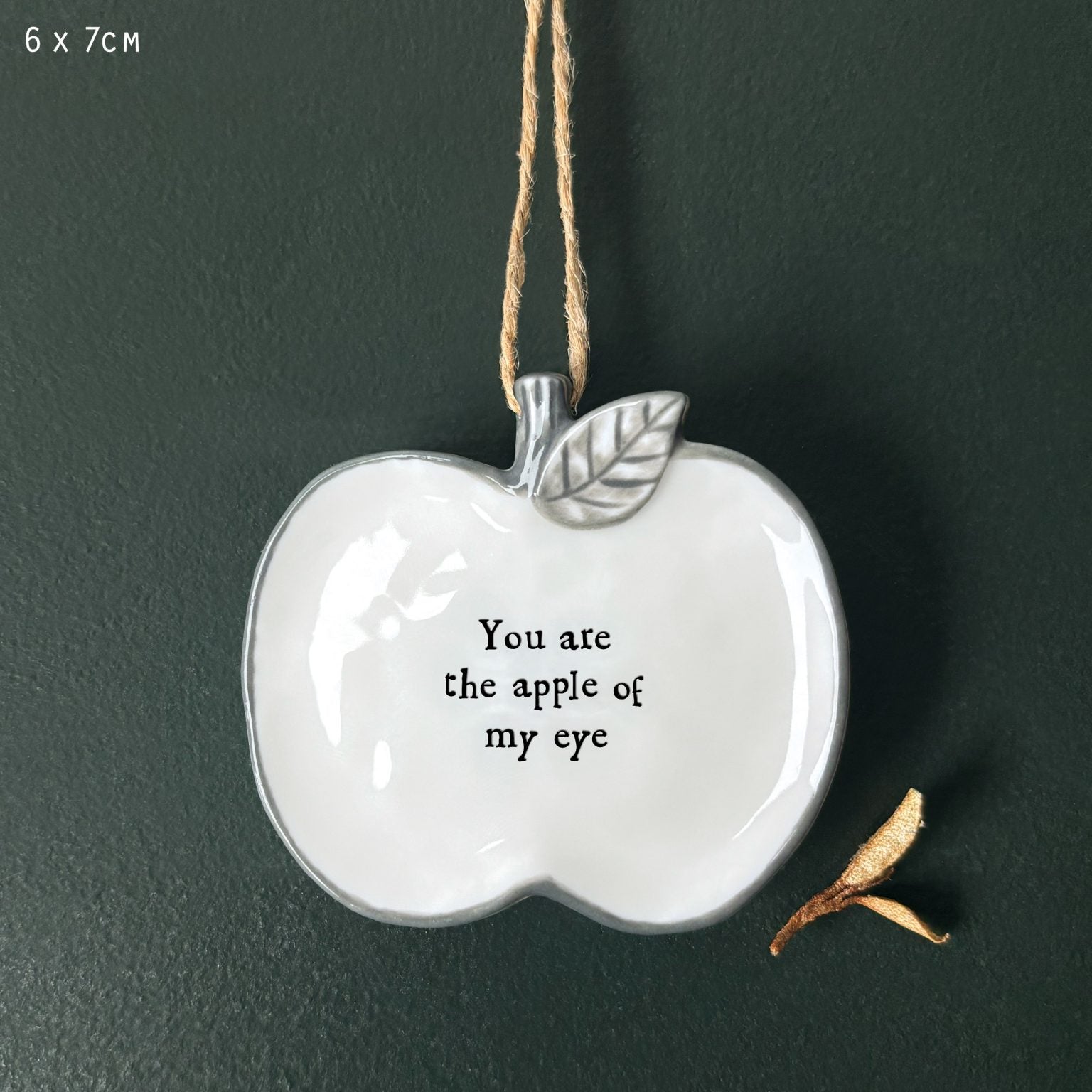 Een klein porseleinen hangertje met de tekst 'You are the apple of my eye'.