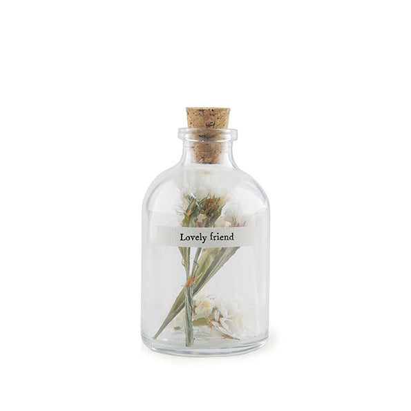 Glazen vaasje met gedroogde bloemen en een kurkstop met het label 'lovely friend'.