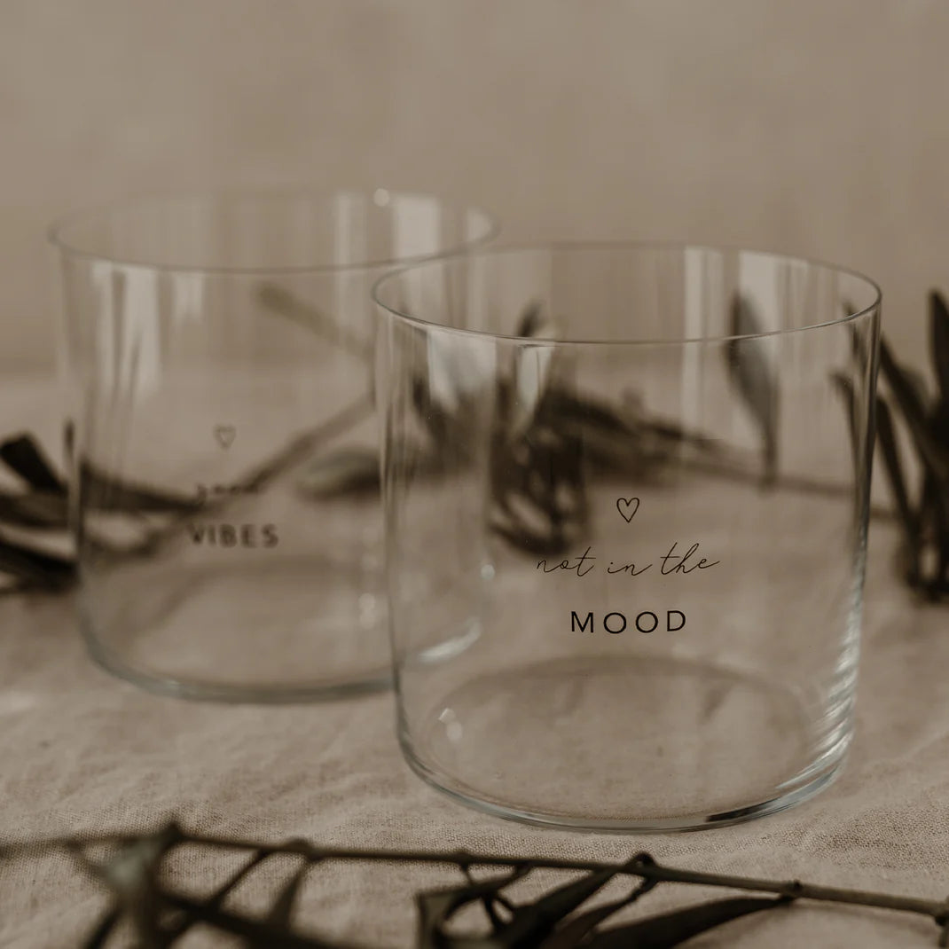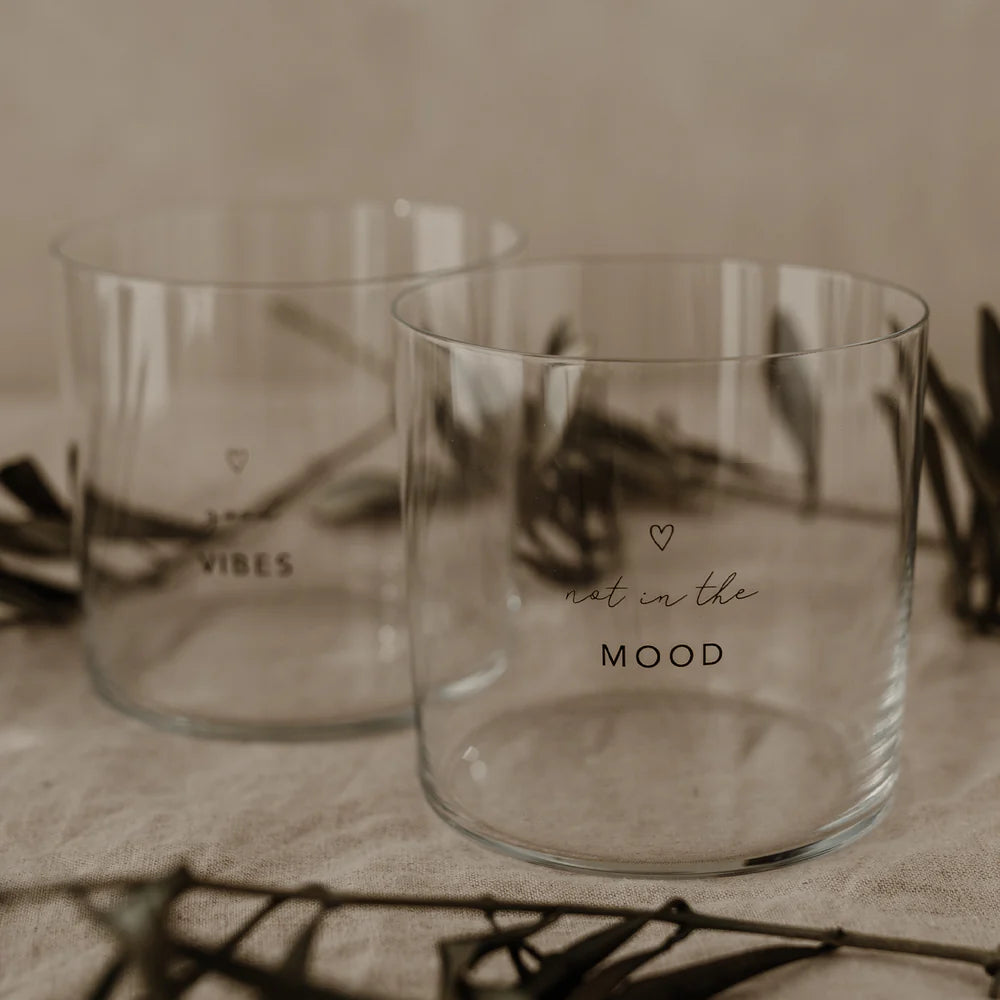Een van de glazen is versierd met de woorden “Not in the Mood” en de andere met de handgeschreven woorden “Good Vibes”.