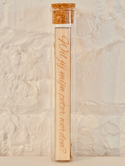 Glazen proefbuisje met houten poppetje 'Wil jij mijn peter/meter worden?'
