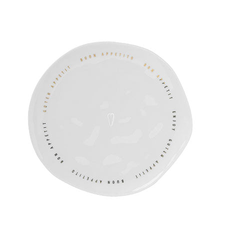 Porseleinen dessertbord met opschrift: "Guten appetit - Bon appetit - Buon Appetito - Enjoy"