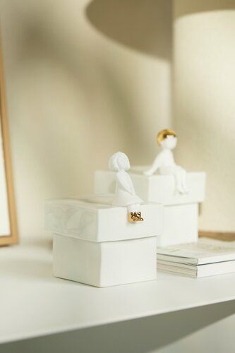 Doosje met een uitgewerkt figuurtje, zittend op het deksel, biedt plaats aan kleine schatten en is een echte blikvanger.