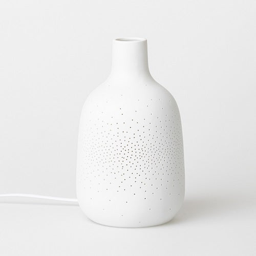 Prachtige lamp in flesvorm van Räder. Deze lamp is gemaakt van mat wit porselein en is voorzien van veel kleine gaatjes waar het licht heel subtiel doorheen schijnt. Deze lamp werkt op elektriciteit. Je draait de onderkant open, plaatst er een lampje in en draait het weer terug in de lamp. Deze lamp vrolijkt jouw interieur op en geeft donkere hoekjes een heerlijk lichte oppepper.