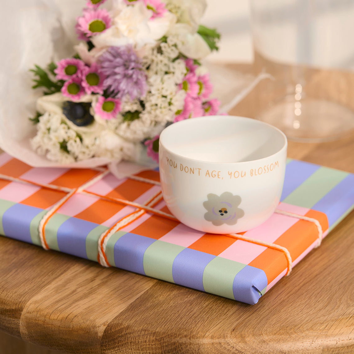 Een porseleinen theelichtje met opschrift "You don't age, you blossom". Wat een geweldig leuk en lief verjaardagskadootje. Geschikt voor een klein waxinelichtje.