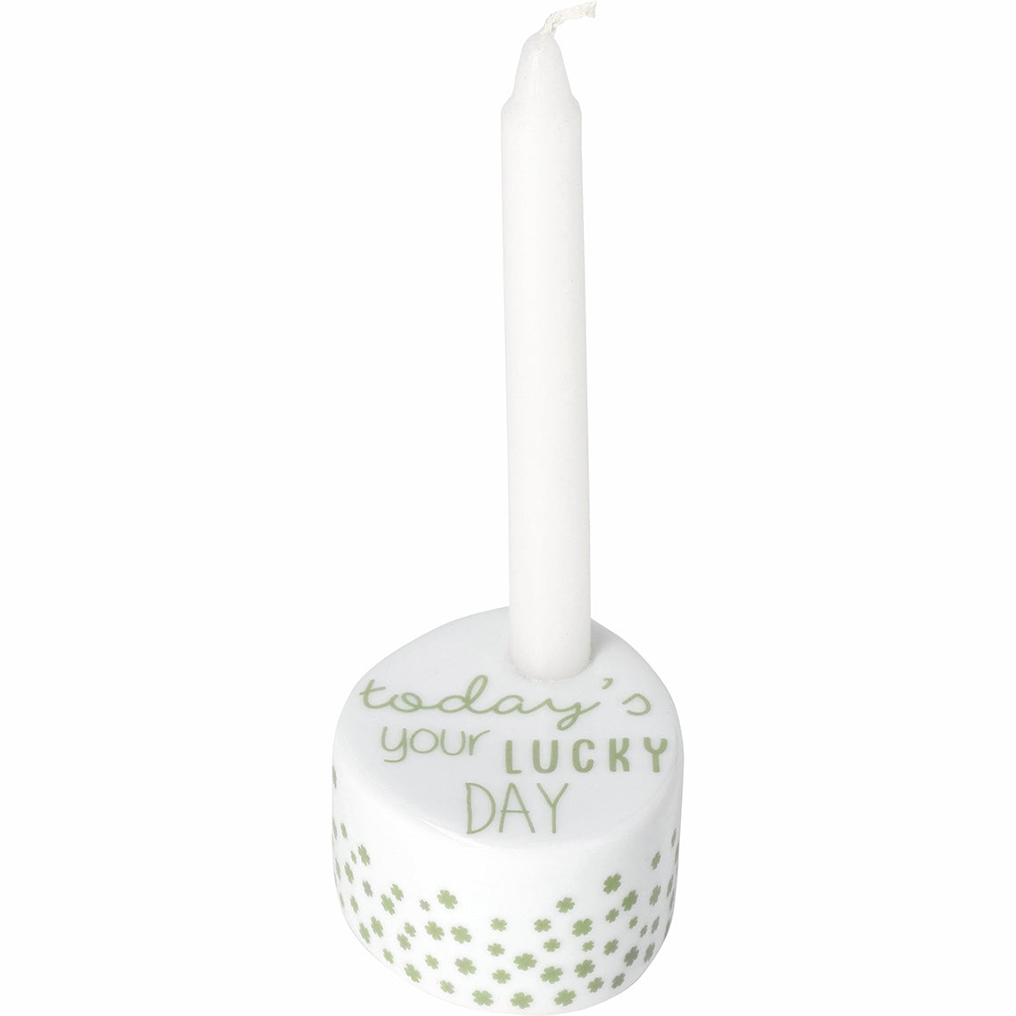 Porseleinen kaarsenhouder met de tekst 'Today's your lucky day'.