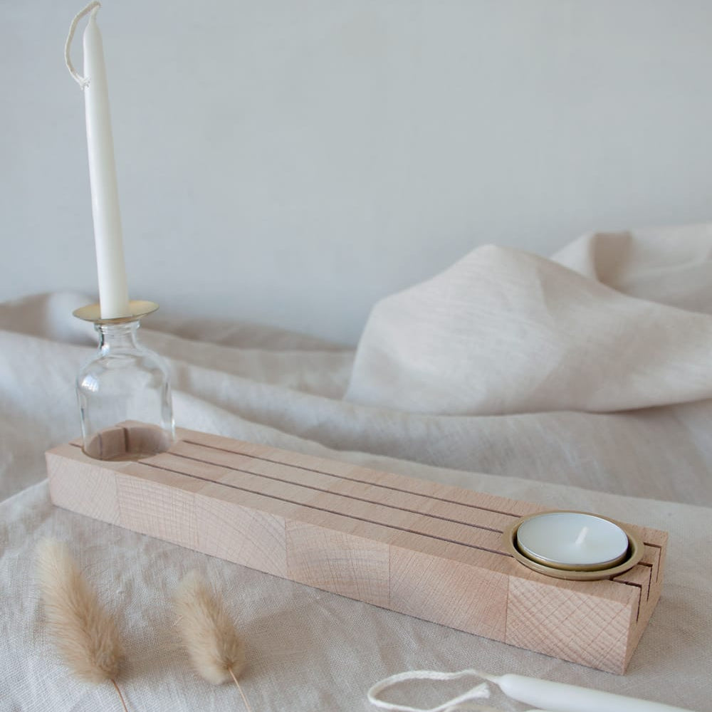 Bijgeleverd: beuken / 1 glazen vaasje H 7cm / waxinelichtje, gouden theelicht houder / 2 takjes gedroogd lagurus / 4 potlood kaarsjes H 12 cm/ katoen/linnen zakje / druppelvanger