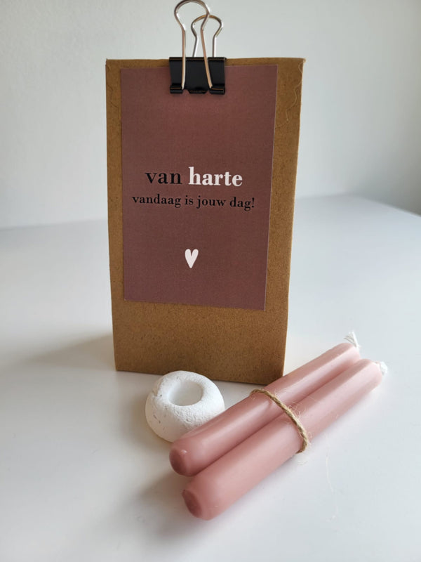 Op het kraft zakje zit een cadeaukaartje met een klem en in het zakje 2 kleine kaarsjes met een kaarshouder