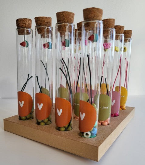 De glazen cadeaubuisjes zijn ideale cadeautjes voor verschillende gelegenheden. Combineer het glazen buisje met een houten houder en een kaartje en je hebt iets heel leuks om te geven.