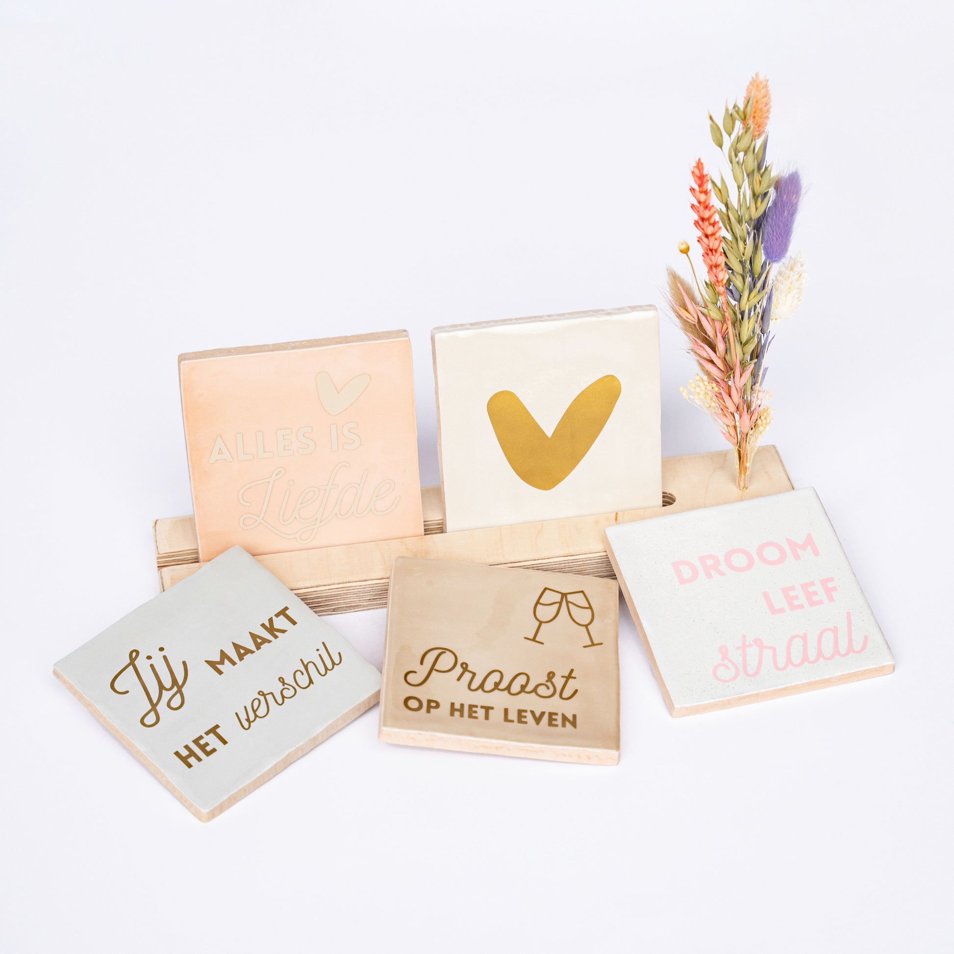 Maak van de Lottea tegeltjes ware eyecatchers middels deze houten houder inclusief droogbloemen! Het handgemaakte houdertje bevat een inkeping waar de tegeltjes perfect in passen en stevig in blijven staan. En met het droogbloemboeketje creeër je een prachtig tafereel dat in iedere kast, in iedere keuken en op iedere tafel prachtig tot zijn recht komt! De bloemetjes in het droogbloemboeketje kunnen variëren maar zijn altijd even mooi en kleurrijk.