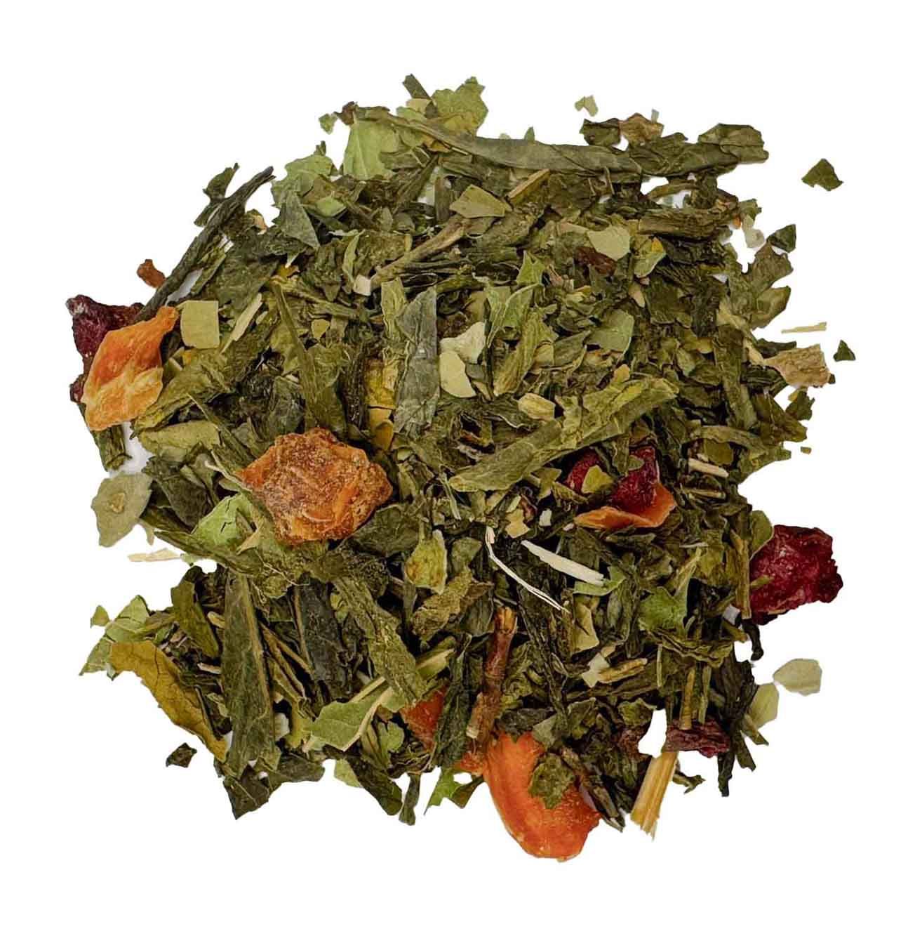 Ook bevat de thee Groene Maté thee. Deze thee brengt ons naar Zuid-Amerika. Aldaar groeit de yerba mate plant op akkers en plantages verspreid over grote delen van Zuid-Amerika. De bladeren van de yerba mate plant worden geoogst, gedroogd, gerijpt en in geschikte stukken gesneden voor het de ’thee’ wordt die we mate noemen. Technisch gezien is mate geen thee omdat het niet van de theeplant (Camellia Sinensis) afkomstig is, maar vanwege de vele gelijkenissen valt het voor ons onder de noemer thee. Het is een unieke theesoort omdat het een krachtig antioxidant is met een hoog cafeïnegehalte en tevens een groot aantal vitamines en mineralen bevat.