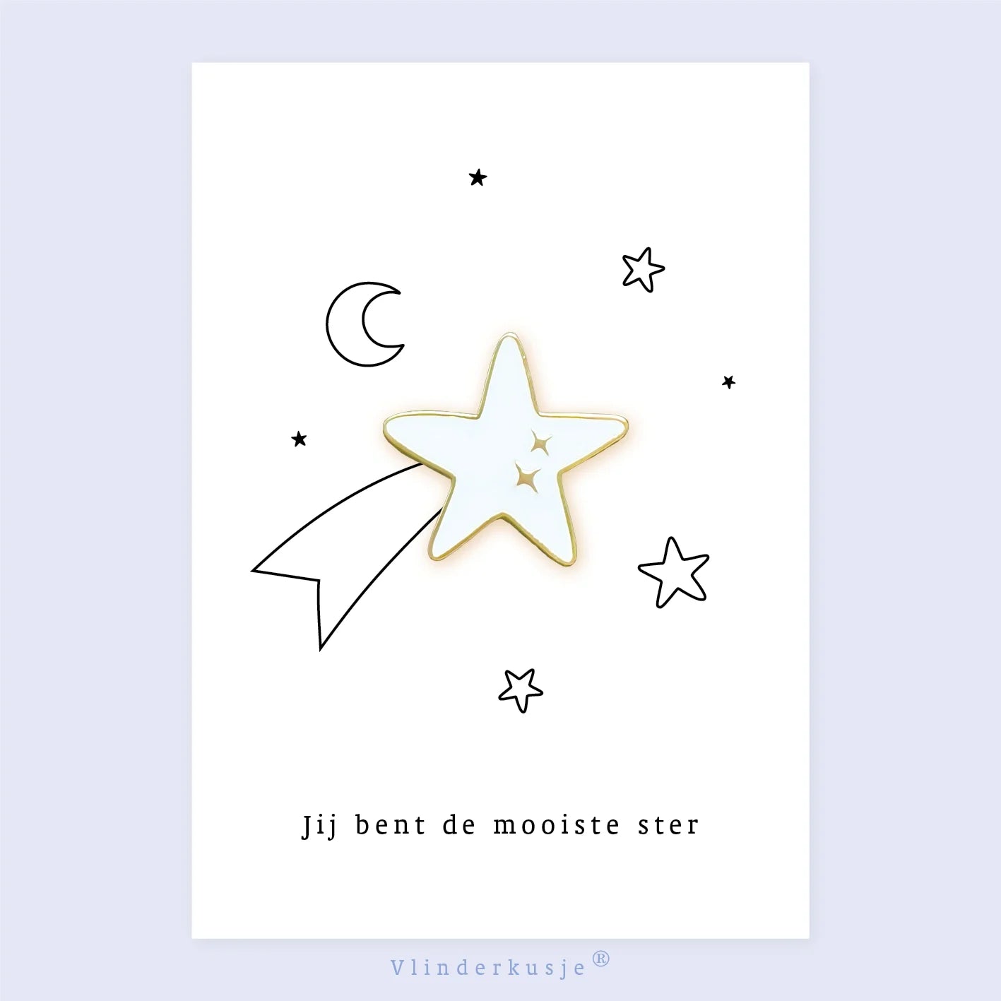 Prachtige pin in de vorm van een ster. Op de achterkant van het kaartje vind je het gedichtje ‘Mooiste ster’.
