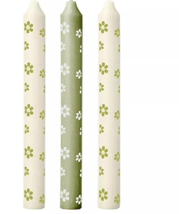 Deze set van drie pimped kaarsen met bloemenprint (Ø2,2 x h.20 cm) in frisse groene tinten voegt een vrolijke, speelse touch toe aan je interieur. De levendige kleuren en het speelse patroon maken deze kaarsen perfect voor zowel moderne als klassieke stijlen. Plaats ze in een stijlvolle kaarshouders of glazen vazen voor een harmonieuze set. Ideaal voor het creëren van een warme, uitnodigende sfeer op tafel of als decoratief accent in de woonkamer.
