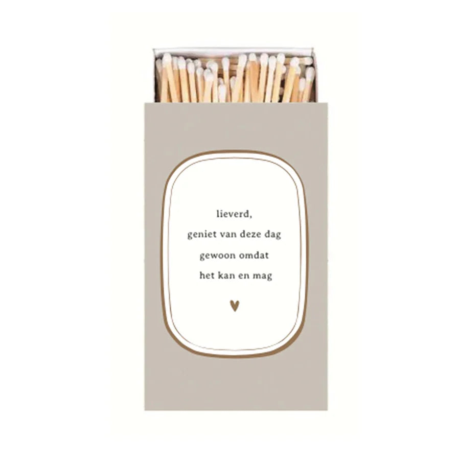 Zelfs de kaarsen aansteken is een feestje met zo’n leuk luciferdoosje. De quote ‘Lieverd, geniet van deze dag gewoon omdat het kan en mag’ zorgt gegarandeerd voor een geluksmomentje. Stop het luciferdoosje niet weg, maar laat hem lekker staan. Daar is ‘ie leuk genoeg voor.